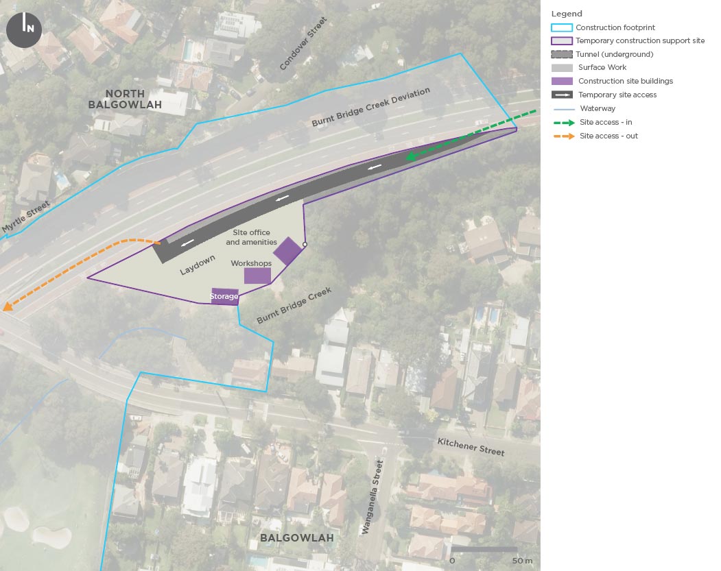 We will be setting up a temporary support site at Punch Street within the Artarmon industrial area. We will use this site to support the excavation and fitout of the tunnels east towards Northbridge, the construction of the Beaches Link cut and cover structures and the permanent motorway facilities for Beaches Link.