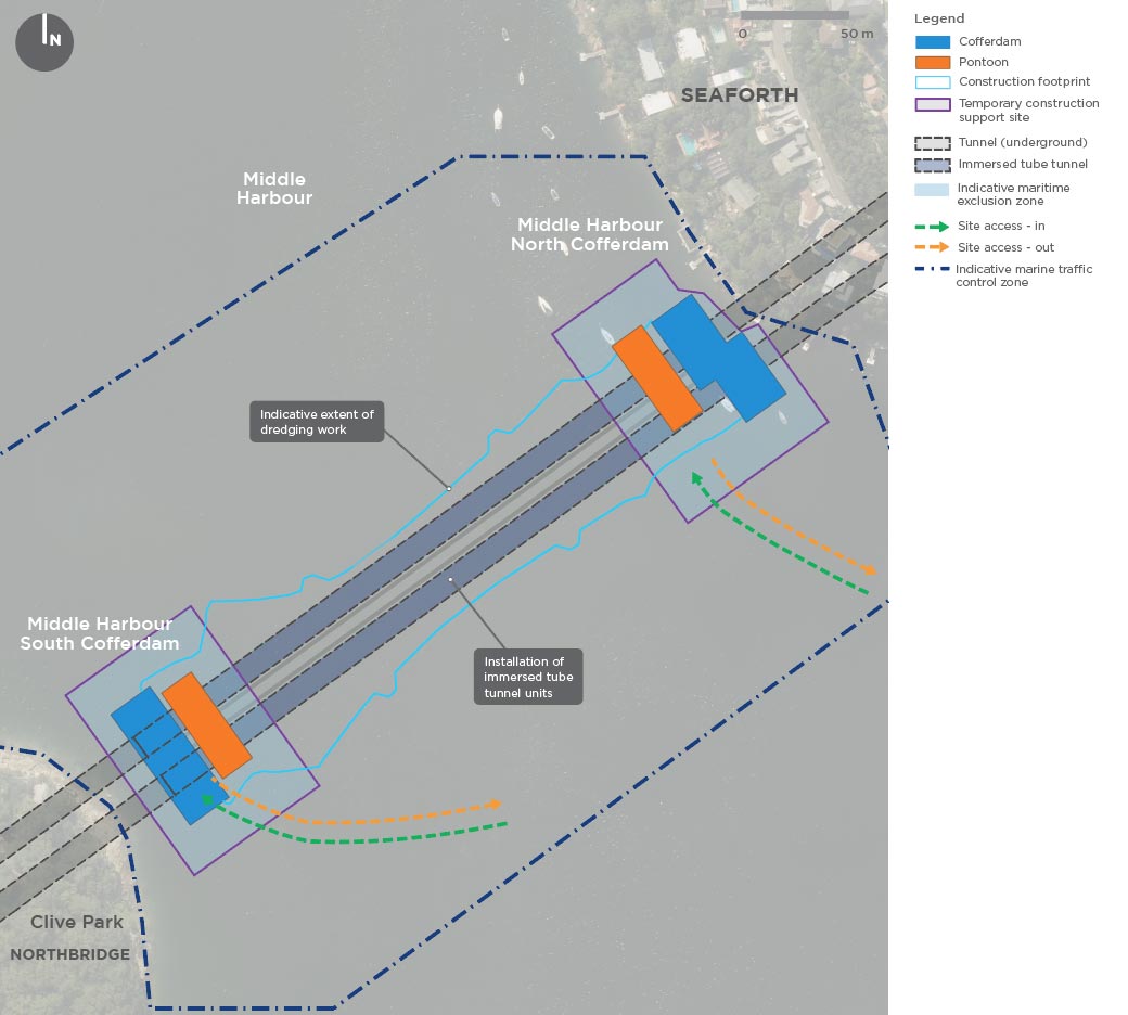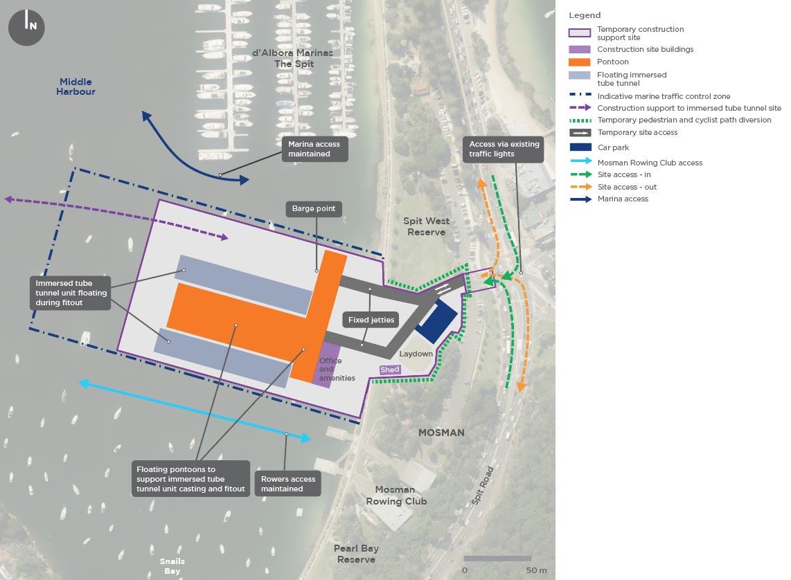 The marine-based site will include a temporary floating immersed tube tunnel casting facility that will be connected to Spit West Reserve by two temporary jetties.