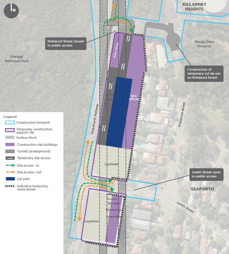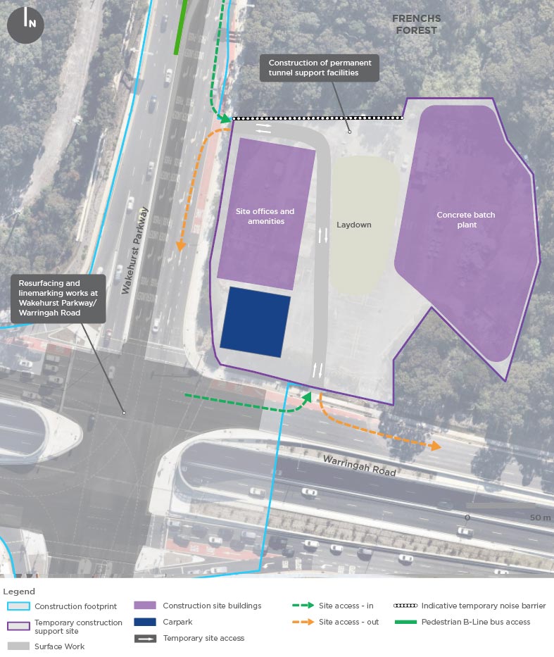 We will be setting up a temporary construction support site on Wakehurst Parkway at Frenchs Forest to support surface road work, intersection work and to build a permanent tunnel support facility. This site was recently used as a construction site for the Northern Beaches Hospital road upgrade.