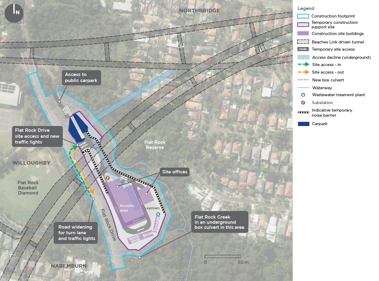 We will be setting up a temporary construction site at Flat Rock Reserve, on the eastern side of Flat Rock Drive. We will use this site to support the excavation and fitout of the tunnels west towards Artarmon, east towards Middle Harbour and south towards Cammeray.