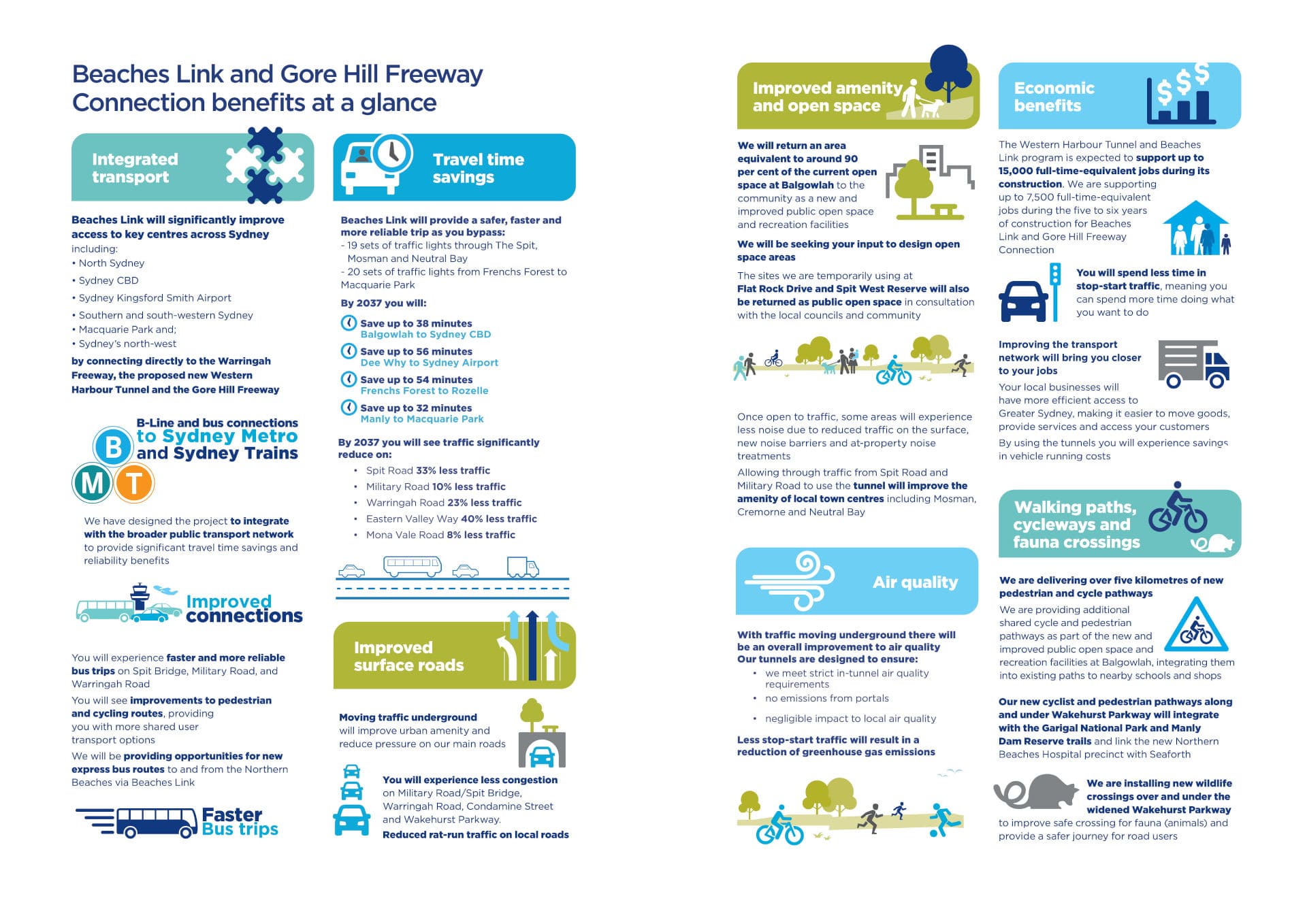 This project will offer new direct connections from the Northern Beaches to Warringah Freeway and North Sydney, the Inner West (via the Western Harbour Tunnel) and St Leonards and Macquarie Park (via the Gore Hill Freeway Connection), linking people with more jobs, education and services. It will also benefit local businesses by providing more direct and efficient access to and from the Northern Beaches for the movement of goods.