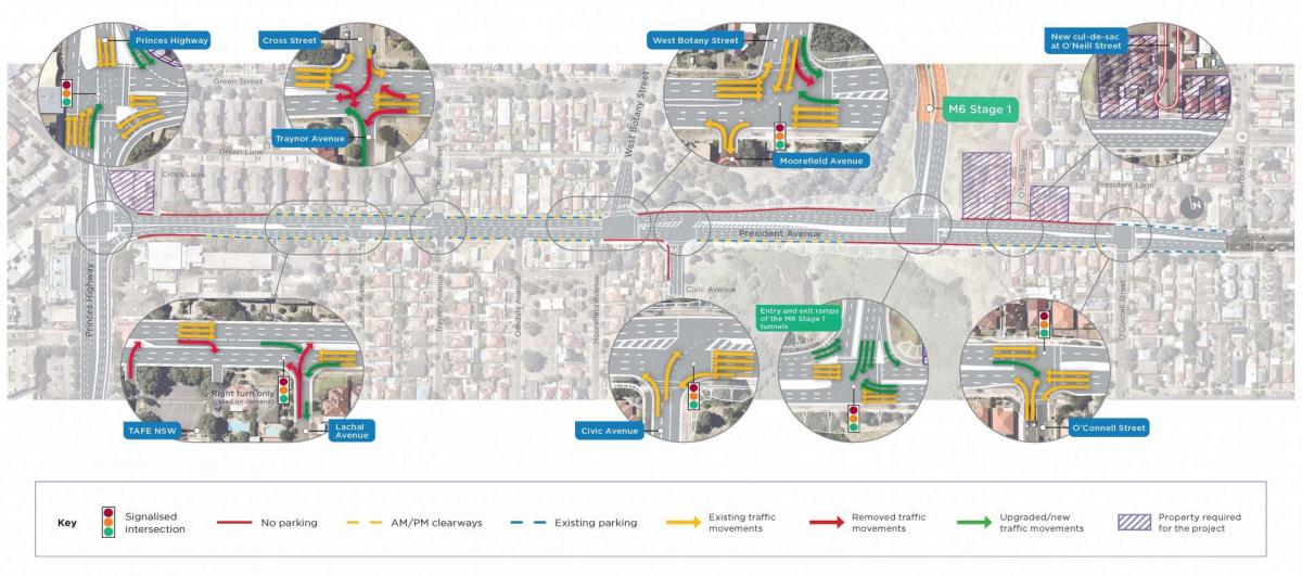 Involves the widening of President Avenue and Princes Highway to provide additional turning lanes to increase capacity and improve traffic flow.