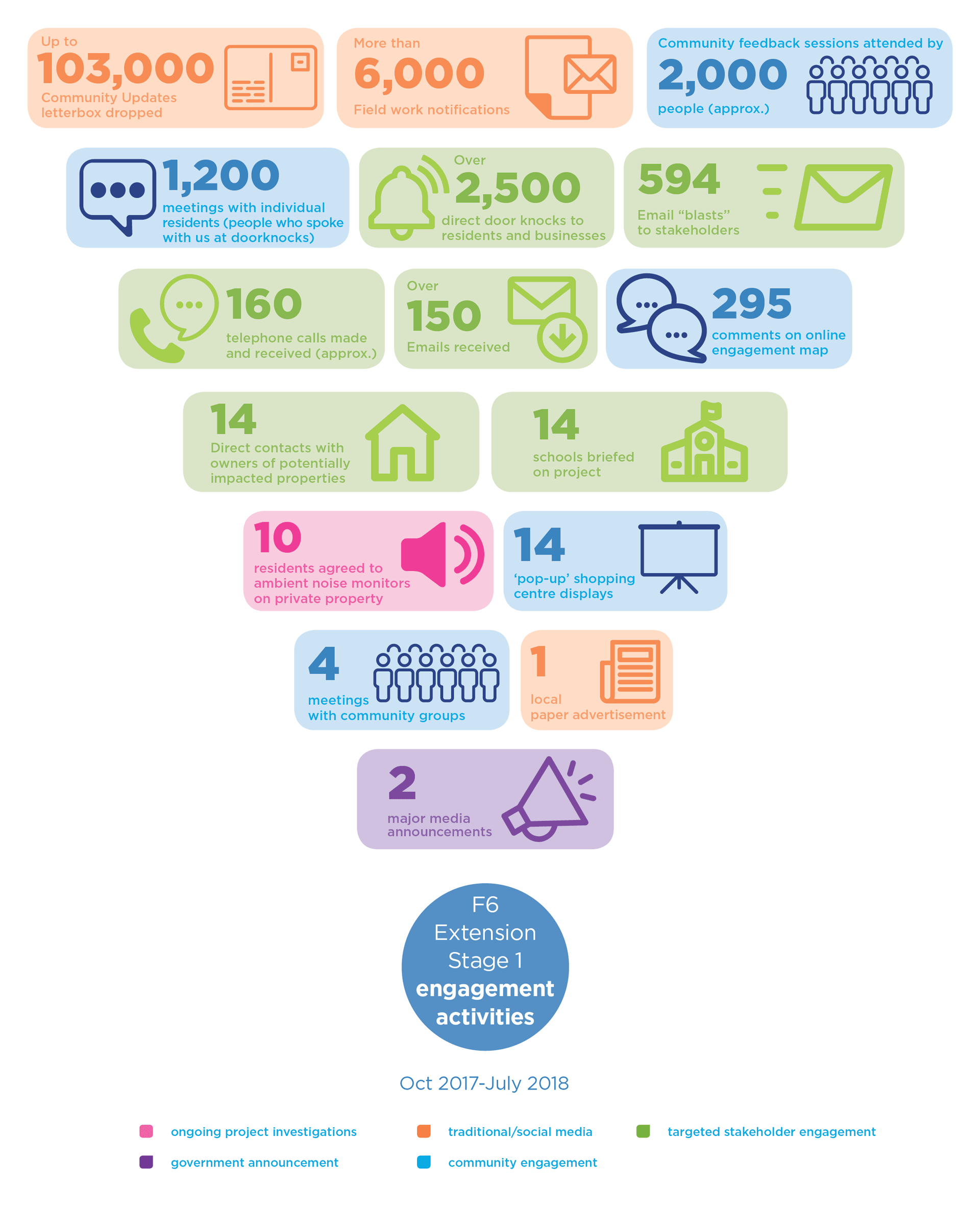 Consultation began in October 2017 with community engagement activities such as doorknocking, the distribution of community updates, pop up events at local shopping centres and briefings with key stakeholders, schools and government agencies. This feedback informed the environmental assessments on increased traffic and congestion, loss of property and green space, local air and water quality as well as noise and emissions from ventilation outlets. From June to August 2018 extensive consultation was carried out to support the release of more detailed project information and design and seek further community feedback.