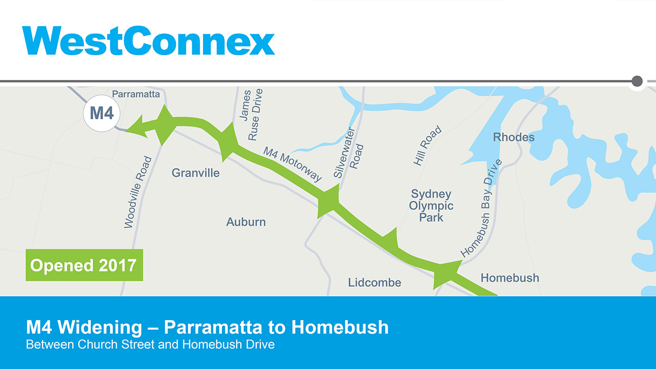 Widening the existing M4 Motorway from Parramatta to Homebush from three to four lanes in each direction.
