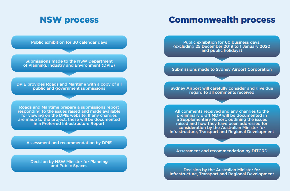 Sydney Airport Corporation will consider all submissions received on the draft MDP. On behalf of Sydney Airport Corporation, Roads and Maritime will prepare a Supplementary Report considering the issues raised and how they will be managed. The report will be submitted to the Minister for Infrastructure and Regional Development for determination.