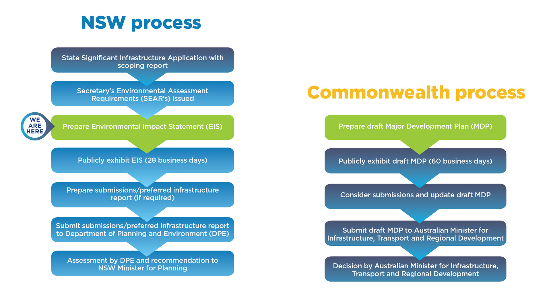 Under the NSW planning process next steps will include preparing an Environmental Impact Statement (EIS) and under the Commonwealth planning process, A Major Development Plan (MDP).