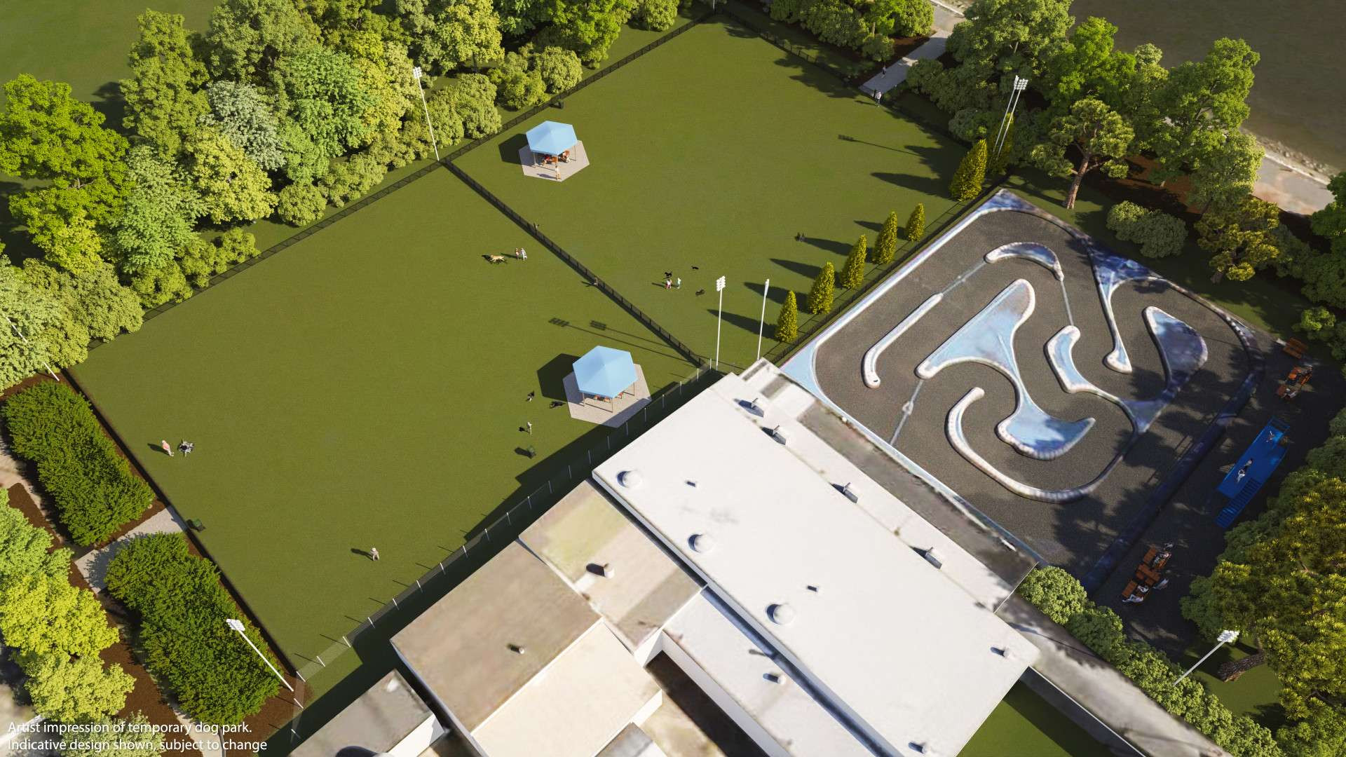 This will be the new location of our temporary dog park during construction. The park includes two fenced areas with a selection of park furniture including water bubblers, rubbish bins and lighting.
