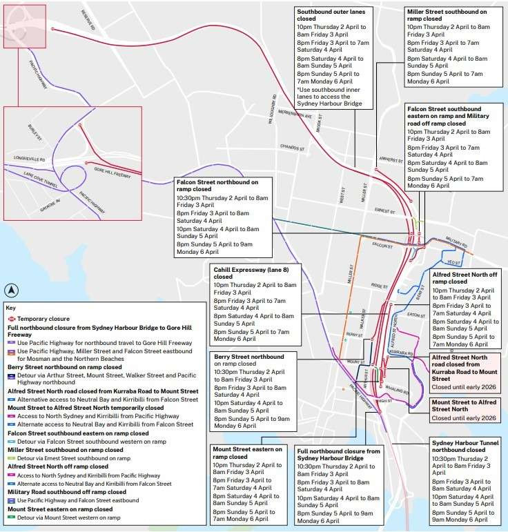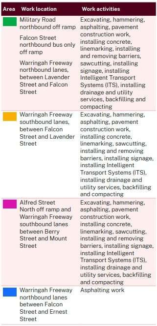 | Alfred Street North off ramp and Warringah Freeway southbound lanes between Berry Street and Mount Street | Excavating, hammering, asphalting, pavement construction work, installing concrete, linemarking, sawcutting, installing and removing barriers, installing signage, installing Intelligent Transport Systems (ITS), installing drainage and utility services, backfilling and compacting | 10pm Thursday 2 April to 9am Monday 6 April 2026 |