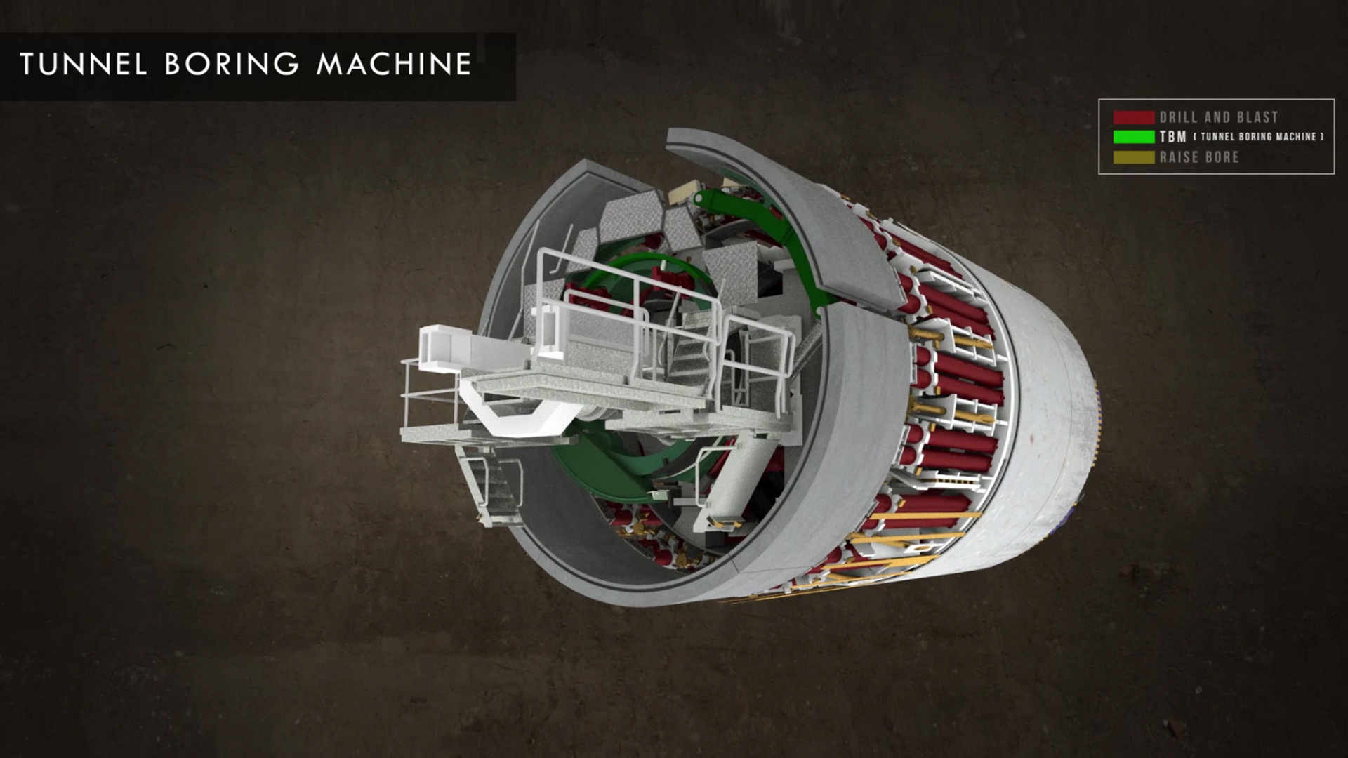 In generating mode, water is released from Tantangara Dam and travels through the power station and into the 7km‐long, 10m diameter tailrace tunnel. A tunnel boring machine (TBM) will be used to excavate the tailrace tunnel, which will be largely concrete-lined. The image shows a TBM operating progressively installing the concrete lining.
