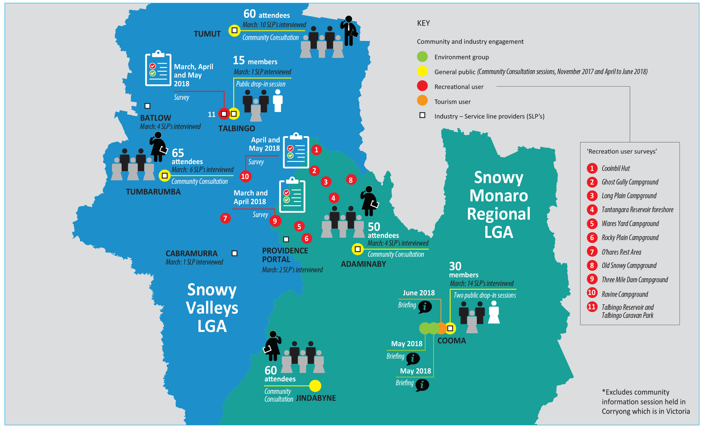 Above: Overview of engagement with the community and industry groups. Source: Exploratory Works for Snowy 2.0 EIS (EMM 2018)