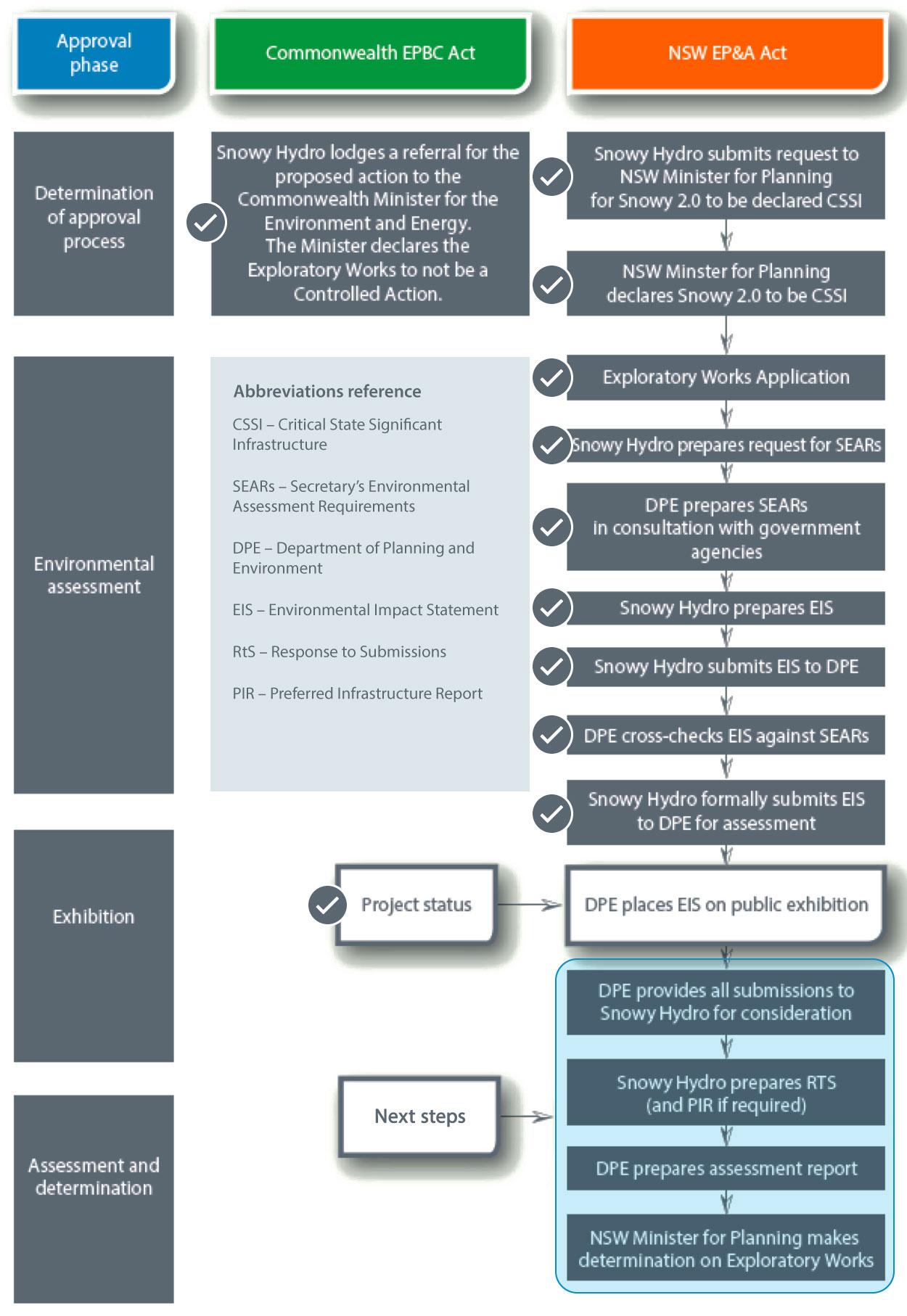 - After reviewing the submissions, Snowy Hydro will prepare a submissions report that responds to the relevant issues raised. If changes are required to the Exploratory Works as a result of the issues raised or to minimise environmental impact, a preferred infrastructure report (PIR) may also be required by the Secretary. If this is required, Snowy Hydro would prepare the PIR to address the changes to the design to minimise impacts and submit this for review to the DPE. The PIR would be made available to the public if the Secretary considers that significant changes are proposed.