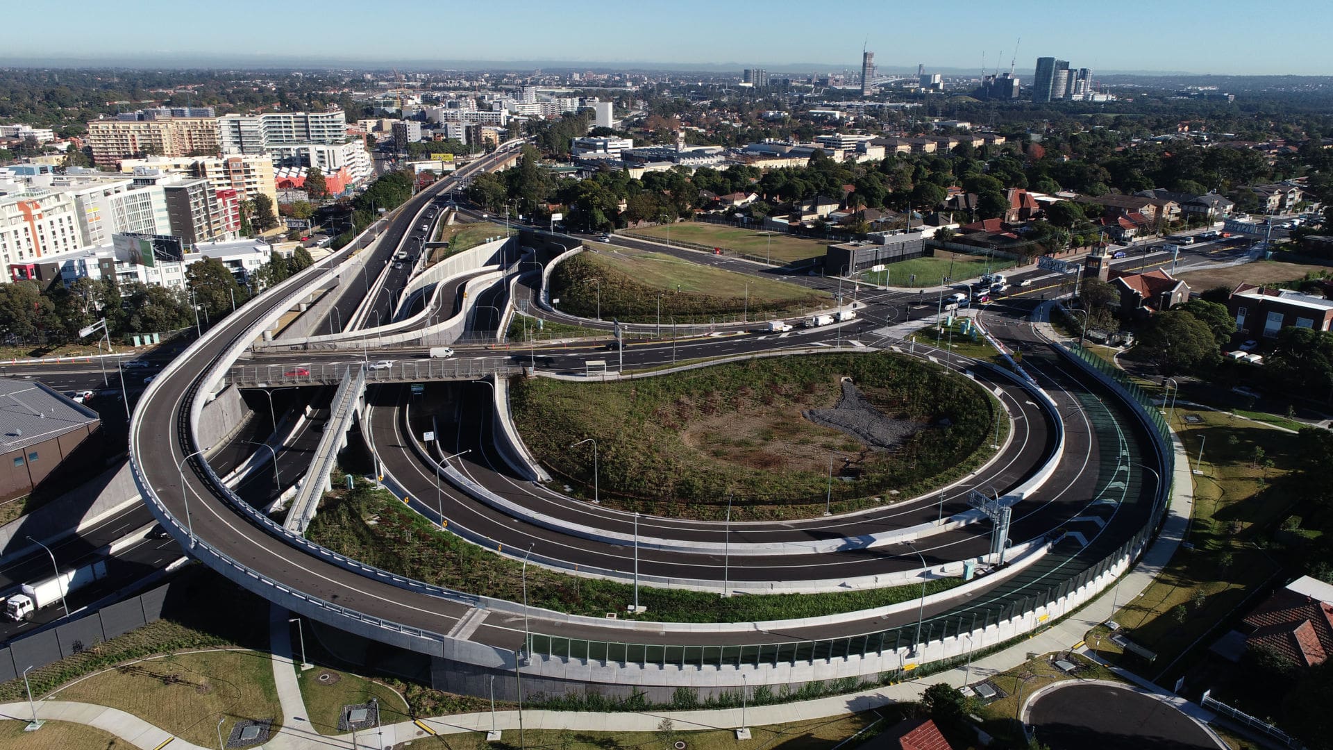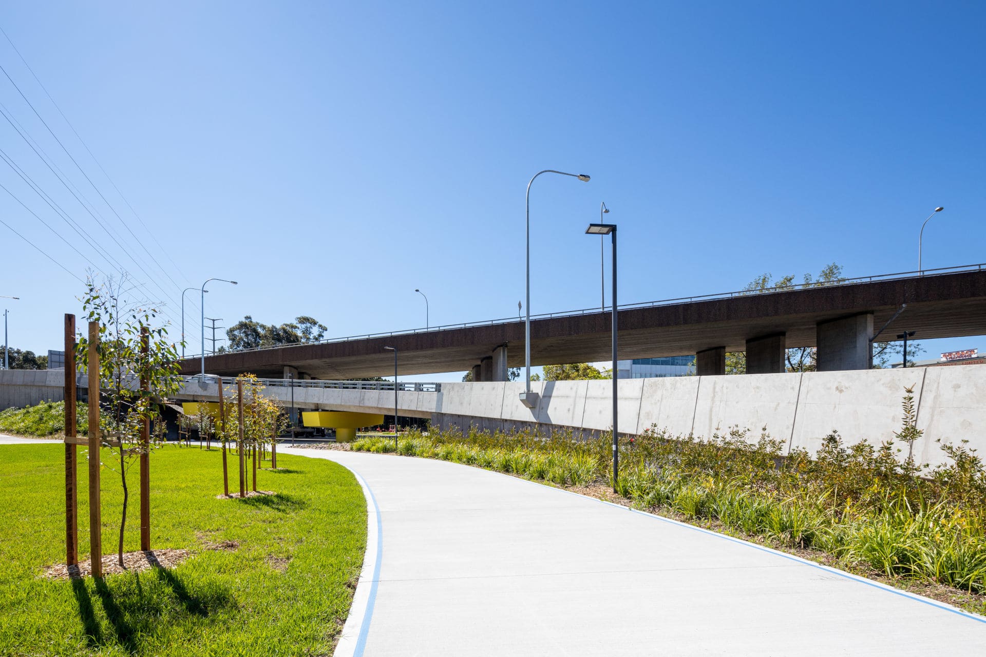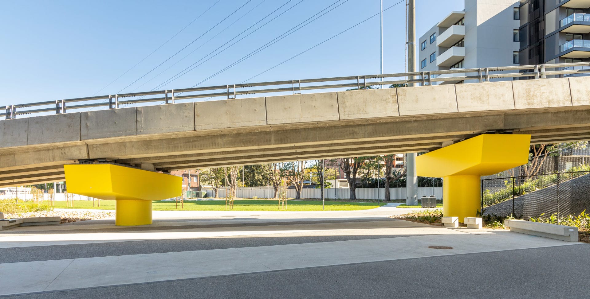 Yioryios Papayioryiou is an emerging, local Inner West artist who works out of his Alexandria studio. He creates minimalist, abstract sculptures inspired by architecture and the built environment. His new work Points of Interception is a seamless, fluid gesture responding to the lines and contours of the new St Peters Interchange. It is also a celebration of local heritage and character. Painted on one side in a vibrant cadmium deep red, it is the iconic colour associated with Federation architecture built throughout the Inner West. While re-imagining the heritage of the area into contemporary sculpture, Points of Interception simultaneously provides a new icon for St Peters that embodies the regeneration and revitalization of the Interchange as part of a major city-shaping project.