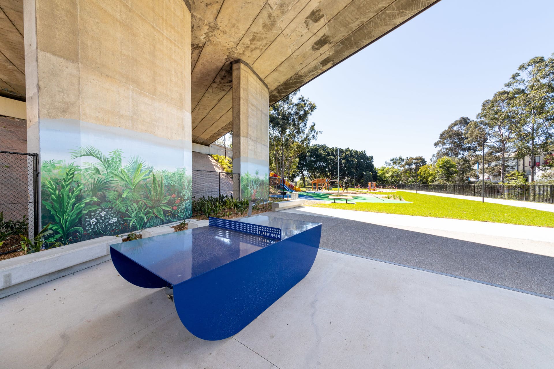 Local street artists Matthew Peet (aka Mistery) and Michael Lothian (aka Jesta) were commissioned nearly two decades ago to paint an underpass mural for Linear Park, Kingsgrove. The artist team is recommissioned for Canal to Creek: The WestConnex M8 Public Art Program to install a new large scale painting in Arinya underpass, bringing a contemporary perspective to the parkland. This time, Mistery and Jesta are making a bigger and bolder statement across the architecture of the tunnel, the artwork literally pouring out of the underpass.