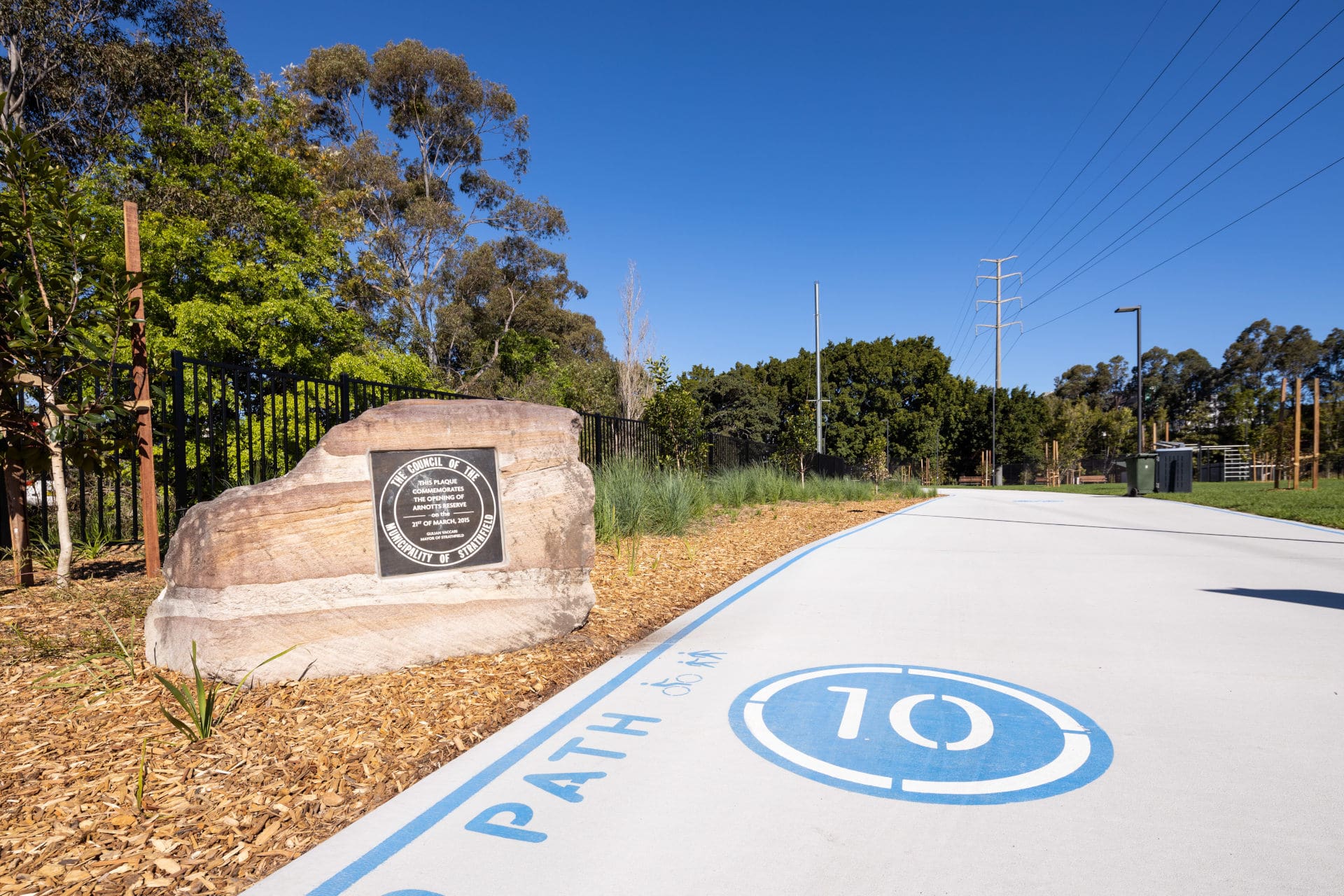 Dan Templeman’s vibrant new work Eight Rings transforms Linear Park near King Georges Road, Beverly Hills. The work is created for the enjoyment and engagement of adjoining residents and users of Linear Park, helping to activate the existing parkland with this exciting cultural intervention.